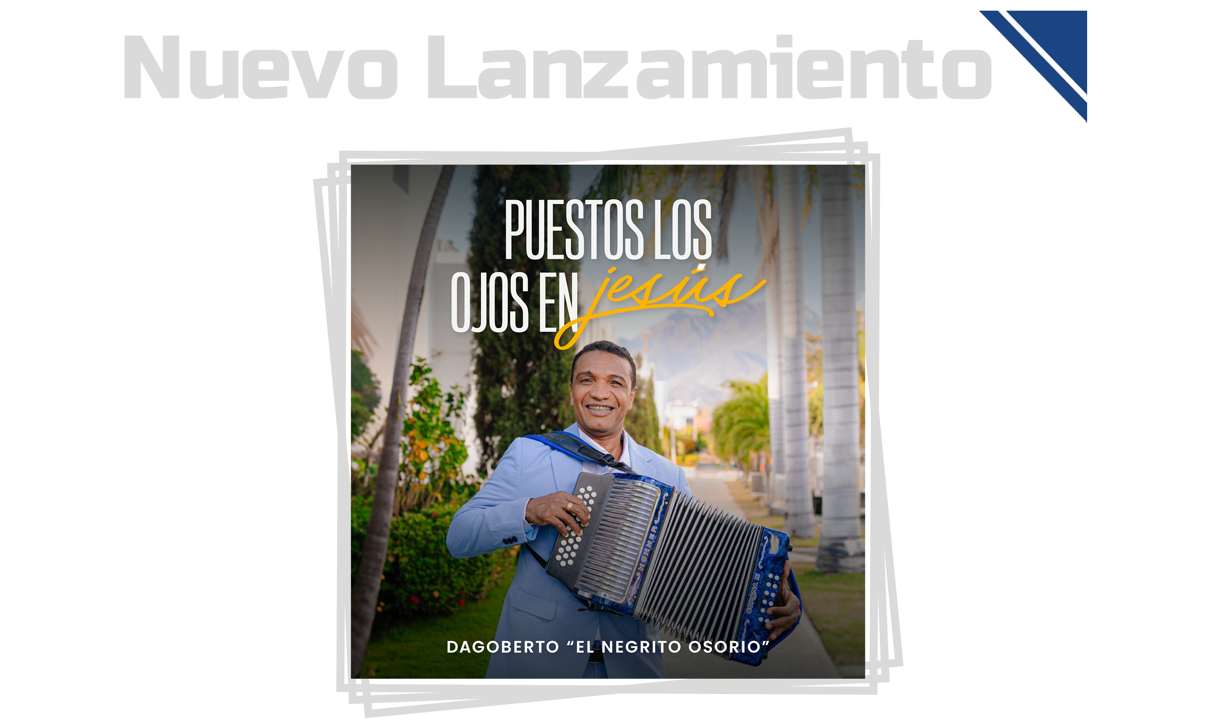 “Puestos Los Ojos En Jesús” es el nuevo álbum de Dagoberto “El Negrito” Osorio, colección de obras que fusionan los ritmos tradicionales del vallenato con mensajes extraídos de la Palabra de Dios. Este proyecto incluye géneros como paseo, bachata, porro, paseaito y chande, cada uno acompañado de letras diseñadas para abordar distintas situaciones de la vida y fortalecer la fe de los creyentes mientras esperan la venida de Cristo. La canción “Puestos los ojos en Jesús” que da nombre al álbum, encapsula el mensaje central de la producción: mantener una fe firme y una mirada puesta en Jesús.